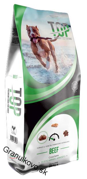 TOP Beef prináša kvalitu do misky vášho psa. TOP Beef je kompletné, vyvážené, pravé krmivo pre psov s vysokou nutričnou hodnotou, schopné ponúknuť optimálny prísun bielkovín, tukov, sacharidov, vitamínov a minerálov užitočných pre výživu a pohodu Vášho dospelého psa.